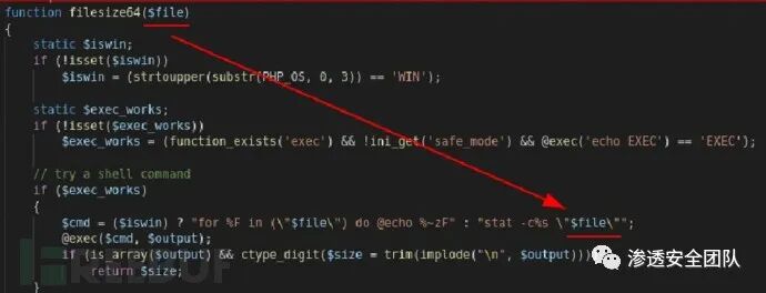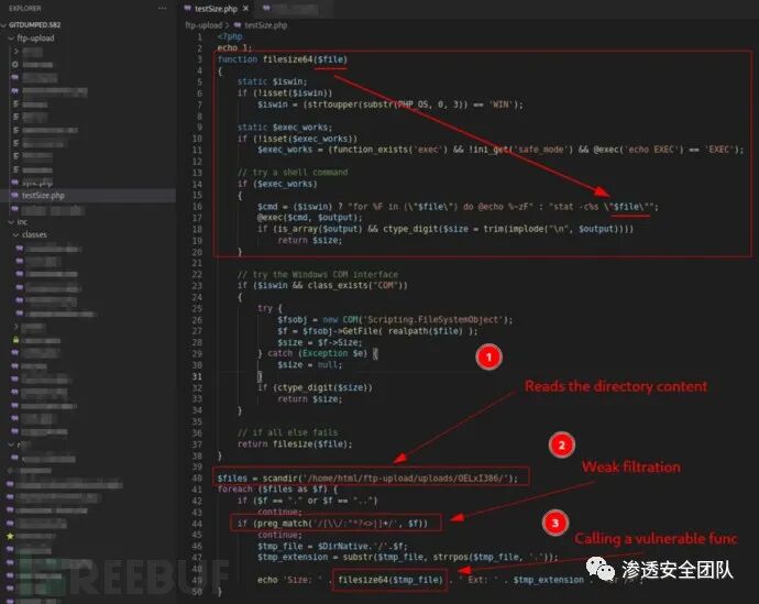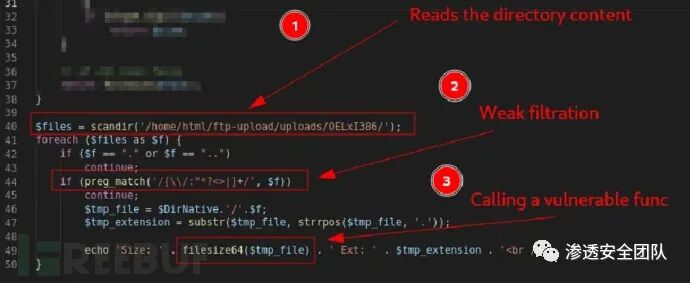 该脚本读取目录/home/html/ftp-upload/uploads/OELxI386/(我们将有效负载上传到其中)的内容,并将其传递给filesize64()函数,在该函数中会调用我们的有效负载代码。