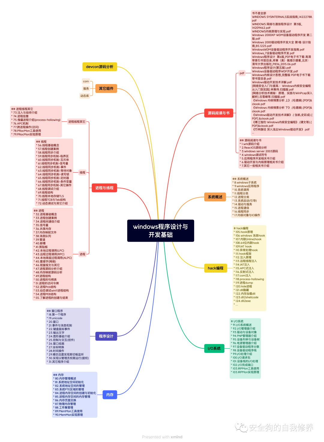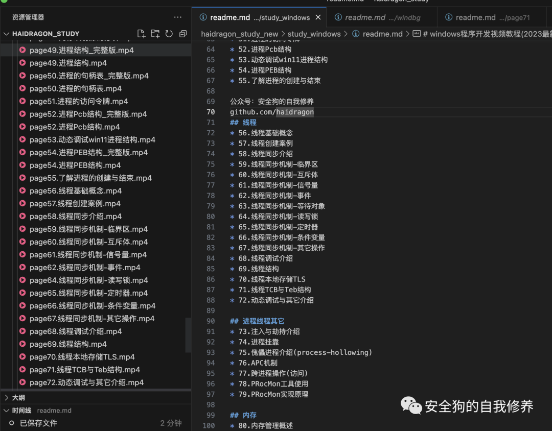 公众号:安全狗的自我修养github.com/haidragon# windows程序开发视频教程(2023最新)0.课程介绍* 0.课程介绍## 源码阅读与书* 1.wrk源码介绍* 2.ReactOS源码分析* 3.windows server 2003源码* 4.windows调试符号* 5.应用程序开发相关书介绍* 6.驱动开发与内核原理相关书介绍* 7.其它一些相关书介绍## 系统概述* 8.windows发展与架构* 9.windows应用程序* 10.系统调用* 11.进程与分类* 12.线程与分类* 13.系统启动(引导)* 14.驱动、服务与模块* 15.进程通信* 16.线程同步* 17.内核对象与IO操作## 窗口程序* 18.第一个程序* 19.unicode* 20.窗口* 21.事件与消息机制* 22.键盘鼠标事件* 23.输出文字* 24.图形基础介绍* 25.控制与交互(控件)* 26.窗口绘画* 27.坐标转换* 28.时间操作* 29.模仿迅雷实现剪切板监听* 30.实现以管理员权限运行(提权)* 31.其它程序介绍公众号:安全狗的自我修养github.com/haidragon## 进程* 32.进程基础概念* 33.进程创建案例* 34.进程间通信介绍* 35.信号量* 36.共享内存* 37.内存映射文件* 38.消息队列* 39.管道* 40.邮槽* 41.剪贴板* 42.本地过程调用(LPC)* 43.远程过程调用(RPC)* 44.本地高级过程调用(ALPC)* 45.套接字(网络)* 46.视窗报文与其它* 47.进程源码分析介绍* 48.内存映射源码分析* 49.进程结构* 50.进程的句柄表* 51.进程的访问令牌* 52.进程Pcb结构* 53.动态调试win11进程结构* 54.进程PEB结构* 55.了解进程的创建与结束公众号:安全狗的自我修养github.com/haidragon## 线程* 56.线程基础概念* 57.线程创建案例* 58.线程同步介绍* 59.线程同步机制-临界区* 60.线程同步机制-互斥体* 61.线程同步机制-信号量* 62.线程同步机制-事件* 63.线程同步机制-等待对象* 64.线程同步机制-读写锁* 65.线程同步机制-定时器* 66.线程同步机制-条件变量* 67.线程同步机制-其它操作* 68.线程调试介绍* 69.线程结构* 70.线程本地存储TLS* 71.线程TCB与Teb结构* 72.动态调试与其它介绍## 进程线程其它* 73.注入与劫持介绍* 74.进程挂靠* 75.傀儡进程介绍(process-hollowing)* 76.APC机制* 77.跨进程操作(访问)* 78.PRocMon工具使用* 79.PRocMon实现原理## 内存* 80.内存管理概述* 81.系统地址空间初始化* 82.系统地址空间的管理* 83.系统PTE区域的管理* 84.进程内存空间的创建与初始化* 85.进程内存空间的内存管理* 86.内存页面交换* 87.物理内存管理* 88.工作集管理* 89.MemMon工具使用* 90.MemMon实现原理# I/O系统* 91.I/O系统概述* 92.I/O管理器介绍* 93.驱动与设备对象* 94.PNP管理器介绍* 95.设备列举与设备树* 96.电源管理器介绍* 97.设备驱动程序分数* 98.设备驱动程序栈* 99.I/O处理介绍* 100.I/O请求包* 101.设备栈的I/O处理* 102.I/O完成端口* 103.IRPMon工具使用* 103.IRPMon实现原理# hack编程* 105.hook原理* 106.windows 消息hook* 107.内联(inline)hook* 108.64位内联hook* 109.IAT hook* 110.异常处理hook* 111.hook框架* 112.注入原理* 113.远程线程注入* 114.IAT注入* 115.APC式注入* 116.反射式注入* 117.com注入* 118.process-hollowing* 119.进程dump* 120.hide进程* 121.dll隐藏* 122.内存加载dll* 123.dll2shellcode* 124.dll2exe* ...