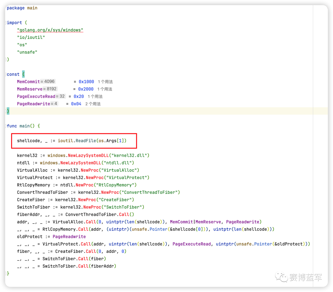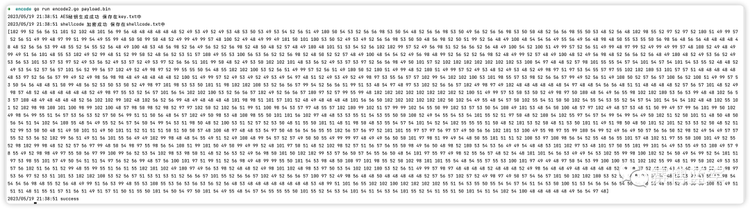 func main() {// 读取shellcodeshellcode, _ := ioutil.ReadFile(os.Args[1])// shellcode转换为fc 格式//fmt.Println(shellcode)shellcode_hex := hex.EncodeToString(shellcode)// 定义AES keykey := time.Now().String()[5:29] //根据时间戳生成一个随机AES秘钥b, _ := AesEncrypt([]byte(shellcode_hex), []byte(key))//fmt.Println("enc_info: " + string(b))err := ioutil.WriteFile("key.txt", []byte(key), 0644)if err == nil {log.Println("AES秘钥生成成功 保存在key.txt中")}err = ioutil.WriteFile("shellcode.txt", []byte(b), 0644)if err == nil {log.Println("shellcode 加密成功 保存在shellcode.txt中")}//解密var infoList = [...]string{"abcwsxedd1234567", "456ybds"}infoList[0] = keyinfoList[1] = bres, _ := AesDecrypt(infoList[1], []byte(infoList[0]))fmt.Println(res)if bytes.Equal([]byte(shellcode_hex), res) {log.Println("success")}}