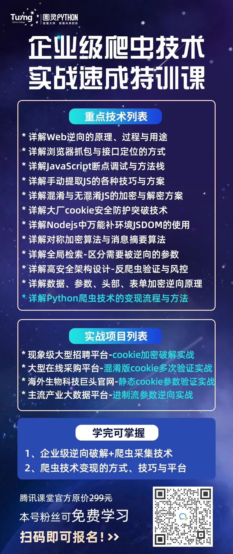 这是一套专讲爬虫逆向破解的高阶技术实战课,迄今为止已帮助近三万学员快速进阶。本次课程将由国际大数据竞赛获奖大佬亲身指导,带领大家进行高阶技术体系+逆向解析项目实战+技术变现路径指导的综合速成训练!