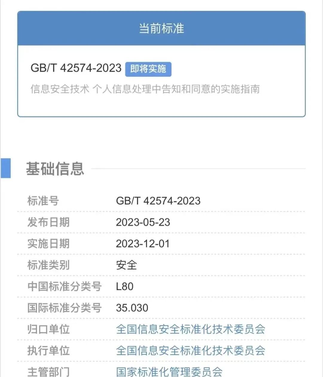 根据2023年5月23日国家市场监督管理总局、国家标准化管理委员会发布的中华人民共和国国家标准公告(2023年第2号),全国信息安全标准化技术委员会归口的多项国家标准正式发布。其中包括了一项个人信息保护方面的重点标准:GB/T 42574—2023 《信息安全技术 个人信息处理中告知和同意的实施指南》(2023年12月1日实施),作为支撑个人信息保护相关法律法规落地的重要参考文件,引起了高度关注。