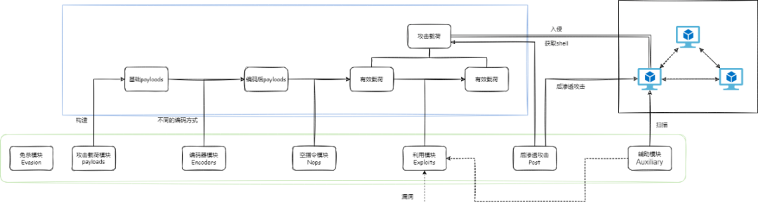 stage: 传输体载荷,如 shell、meterpreter 等。在 stager 建立好稳定的连接后,攻击机将 stage 传输给目标机,由 stagers 进行相应处理,将控制权转交给 stage。比如得到目标机的 shell,或者 meterpreter 控制程序运行。