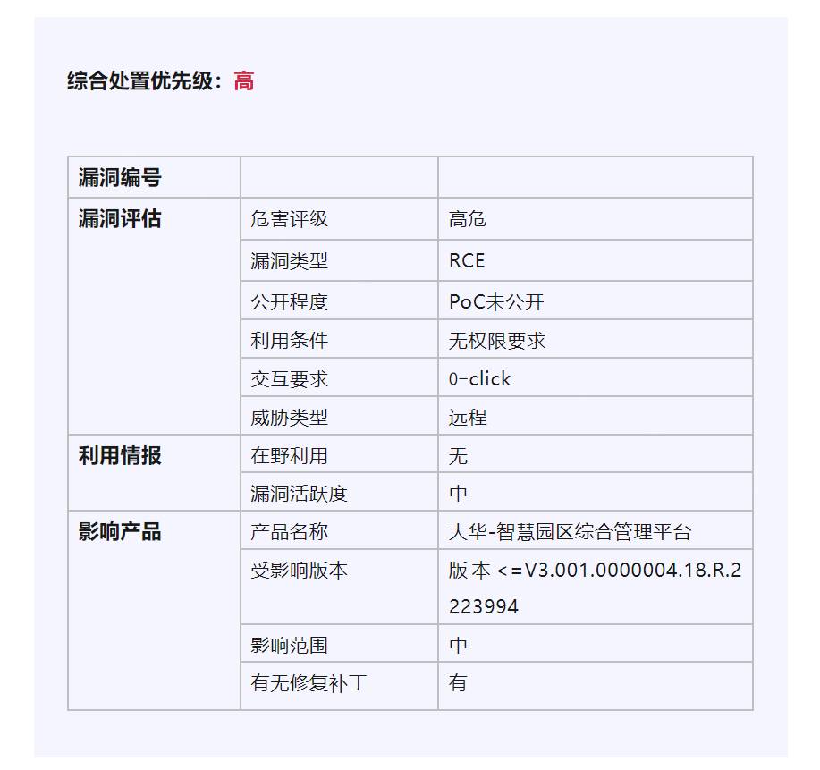 01 漏洞概况 大华智慧园区综合管理平台是一个集智能化、信息化、网络化、安全化为一体的智慧园区管理平台,旨在为园区提供一站式解决方案,包括安防、能源管理、环境监测、人员管理、停车管理等多个方面。近日,
