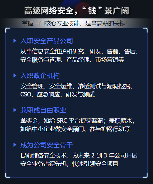 • 有哪些企事业单位在招聘安全人才?如何才能应聘?为普及网络安全行业技术,51CTO联合国内一线网络安全实战大牛陈鑫杰老师,深度结合国内一线互联网、网络安全、政企单位的安全项目需求,经过为期1年的打磨与迭代,共同研发推出了这套深入浅出的网络安全职业实战直播课程《网络安全攻防第1课》。这门课真正能够帮助你科学体系化地学习前沿安全技能,了解安全行业。![]()