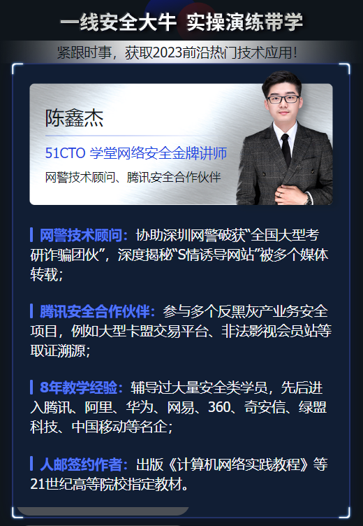 我们的主讲老师陈鑫杰老师,具有多年一线互联网、金融 、政府等安全实战项目经验,擅长网络安全、Web安全、渗透测试、数字取证等领域,曾主导多个国土、电力等千万级项目;是全国多个地区的网警技术顾问,较早将网络安全技术应用于反诈防骗领域,多次协助警方破获大型诈骗团伙。 ![]()