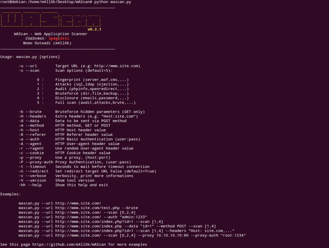 # 高级用法$ python wascan.py --url http://xxxxx.com/test.php --scan 5 --auth "admin:1234"$ python wascan.py --url http://xxxxx.com/test.php --scan 5 --data "id=1" --method POST$ python wascan.py --url http://xxxxx.com/test.php --scan 5 --auth "admin:1234" --proxy xxx.xxx.xxx.xxx $ python wascan.py --url http://xxxxx.com/test.php --scan 5 --auth "admin:1234" --proxy xxx.xxx.xxx.xxx --proxy-auth "root:4321"$ python wascan.py --url http://xxxxx.com/test.php --scan 5 --auth "admin:1234" --proxy xxx.xxx.xxx.xxx --proxy-auth "root:4321 --ragent -v