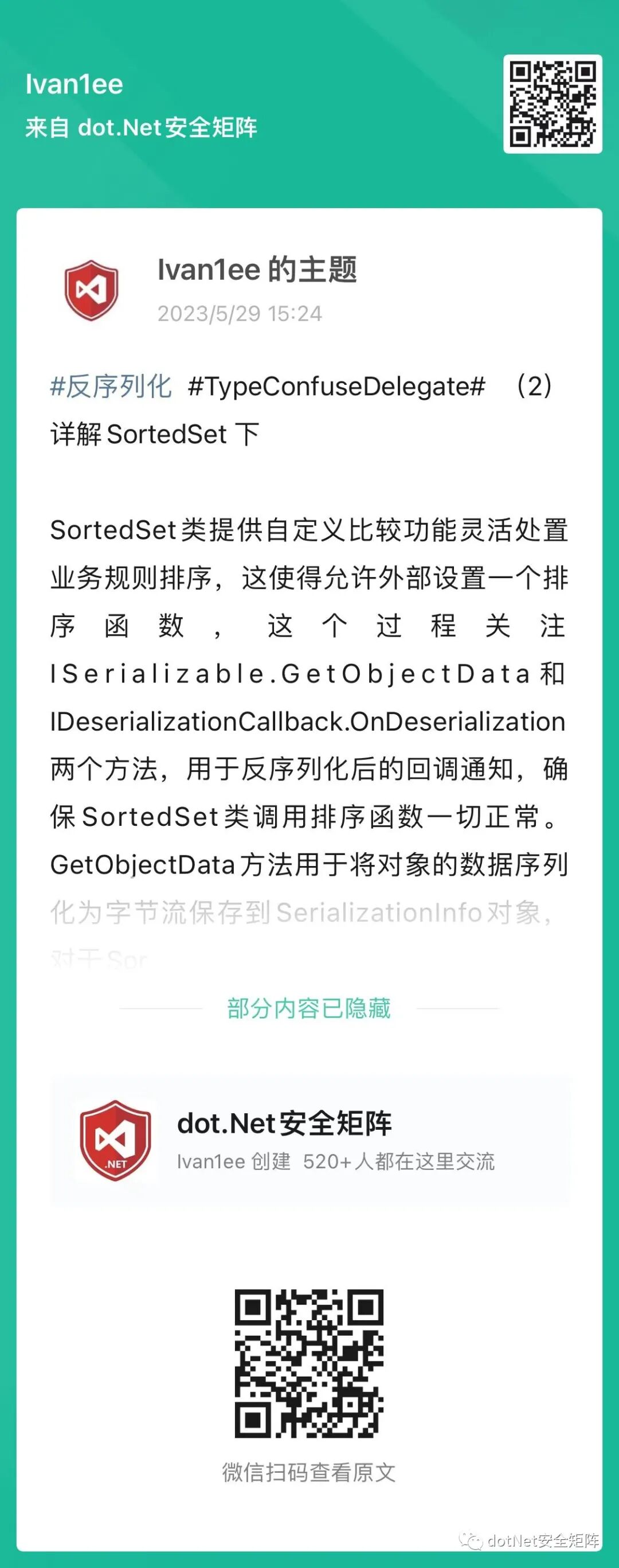 dotNet安全矩阵知识星球 — 聚焦于微软.NET安全技术,关注基于.NET衍生出的各种红蓝攻防对抗技术、分享内容不限于 .NET代码审计、 最新的.NET漏洞分析、反序列化漏洞研究、有趣的.NET安全Trick、.NET开源软件分享、. NET生态等热点话题、还可以获得阿里、蚂蚁、字节等大厂内推的机会