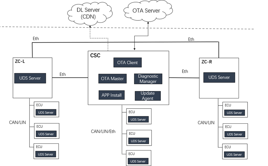 3、APP Install: 负责升级中央计算平台CSC,左区控制器ZC-L,右区控制器ZC-R的应用程序。