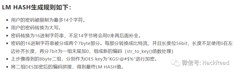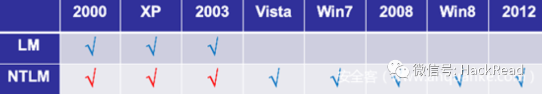 LM Hash 是 Windows 使用的最古老的密码存储,其历史可追溯到 1980 年代的 OS / 2。在 LAN Manager 协议中使用,由于允许的字符集有限,因此它们很容易破解。如果仍然可用,则可以从 Windows 系统上的 SAM 数据库或域控制器上的 NTDS 数据库中获取它们