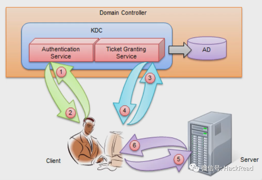 其中 KDC 服务默认会安装在一个域的域控中而 Client 和 Server 为域内的用户或者是服务如 HTTP 服务 SQL 服务。在 Kerberos 中 Client 是否有权限访问 Server 端的服务由 KDC 发放的票据来决定。