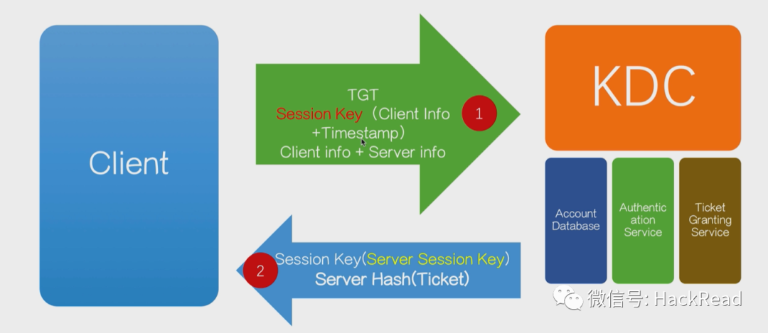 TGT:KDC hash(AD 某个特殊用户的 NTLM Hash)加密一个客户端的信息(认证之后产生的),Session key 与 AS 的是一样的