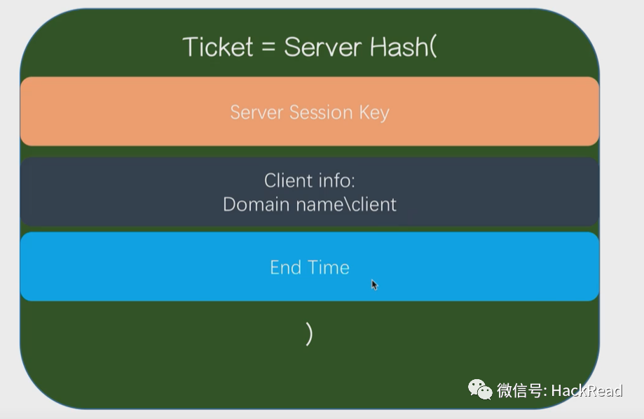 Ticket=Server Hash(Server Session Key + Client info + End time)