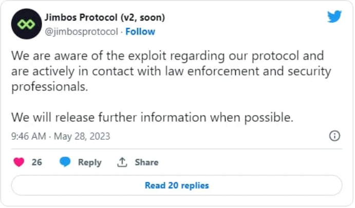5月28日,Jimbos发推证实了该攻击时间,称已通知了执法机构,并正在解决相关的安全问题。