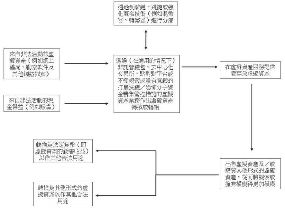 文件还提供了如何识别虚拟货币相关洗钱的内容:由虚拟资产业务所促成的交易可能以现金作交易,所以此类业务可能被用作存放从犯罪活动所得的现金得益。此外,虚拟资产业务可能被利用来处置或存放从非法活动所得或与上游罪行(例如网上骗局、勒索软件及其他网络罪案)有关联的虚拟资产。虚拟资产业务亦有可能被用于洗钱的第二个阶段,即分层交易。为模糊非法活动所得的虚拟资产的来源,不法分子或洗钱人士可能会在不同的钱包地址、服务提供者、虚拟资产的类别或区块链之间转移资产。他们可能会利用虚拟资产特有的分层技术,例如剥离链和跳链。虚拟资产有时会通过强化匿名服务而被清洗。非托管钱包、去中心化虚拟资产交易所、点对点平台或不受规管或设有宽松的打击洗钱/恐怖分子资金筹集管控措施的虚拟资产业务,对不法分子或洗钱人士来说极具吸引力。