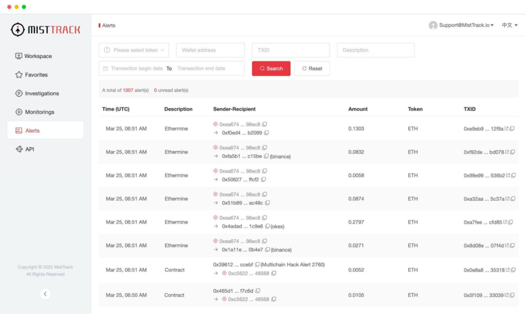 其二,MistTrack(https://misttrack.io)链上追踪平台围绕“链上监测”,“反洗钱风险”等方面,结合多维的恶意地址数据、全面的地址主体标签数据等为客户检测链上问题资产(KYT),及时有效地阻断链上黑产洗币。目前,MistTrack 已支持 Bitcoin、Ethereum、Binance Smart Chain、Avalanche、TRON、Polygon、IoTeX、Arbitrum 八条链,MistTrack 追踪已服务客户 90+,累计追回资产 $1,000,000,000+。