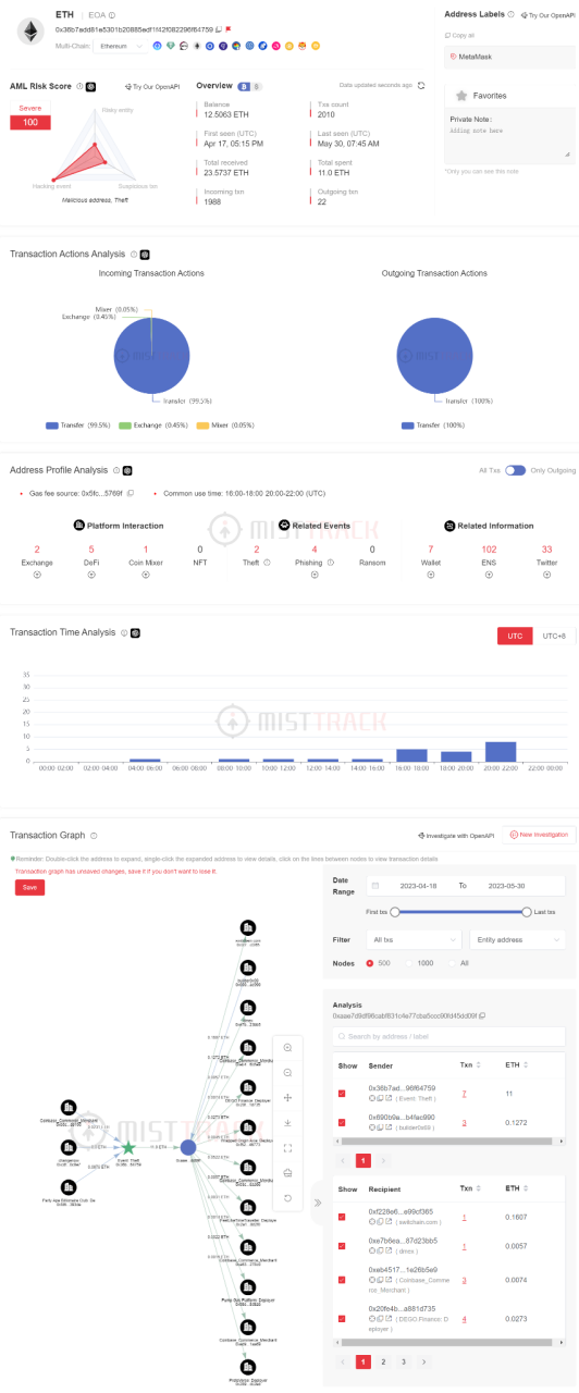 地址画像,可视化展示:系统不仅能识别该地址属于什么实体,如 Coinbase、Binance,还能识别很多链上链下标签,包括 ENS、MEV Bots、DeFi 鲸鱼,甚至能识别出使用了哪个钱包应用,如 imToken/MetaMask。通过地址标签,可以更好地了解可疑的地址。另外,系统会对地址的所有历史交易进行解析,并以人类可读的方式归纳、总结这些行为,平台可以快速了解地址的历史,对目标地址作出行为画像,同时能够在海量交易数据中分析出一些异常资金网络。