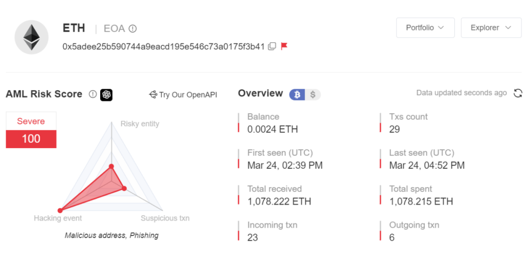 多维度风险检测:MistTrack 会从地址所属实体、地址历史交易活动、慢雾恶意钱包地址库三方面为地址计算 AML 风险评分。当地址所属实体为高风险主体(如混币平台)或地址与已知的风险主体存在资金来往时,系统会将该地址标记为风险地址。同时,结合慢雾恶意钱包地址库中的恶意地址数据集,对已核实的勒索、盗币、钓鱼欺诈等非法行为的涉案地址进行风险标记。也就是说,平台可以洞察每个钱包地址的风险,并检查钱包地址是否涉及非法资金。