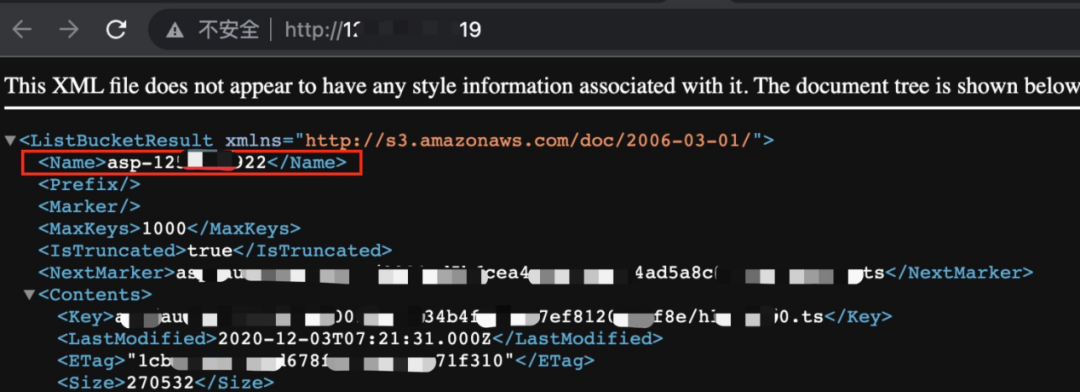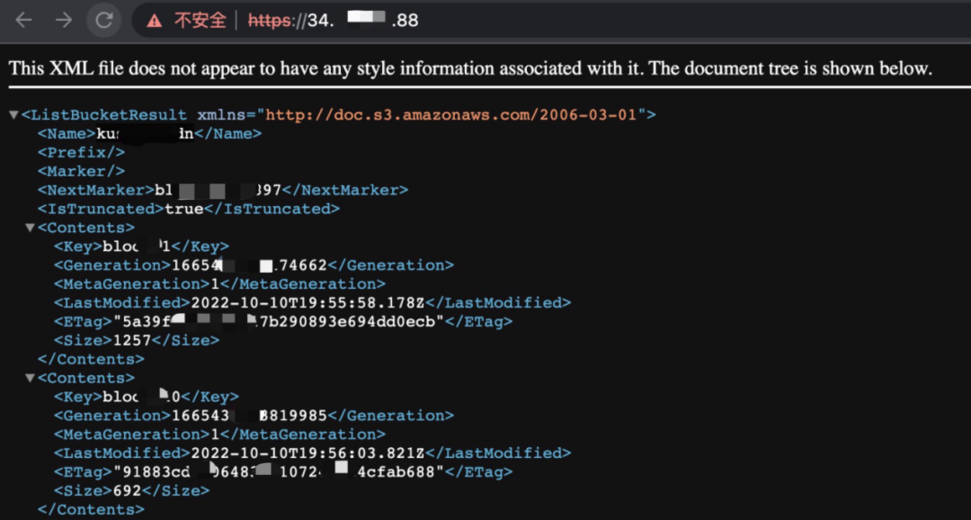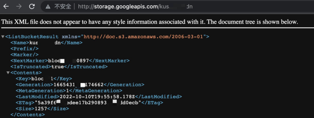 存储桶地址访问示例: http://softxxxx.s3.amazonaws.com,返回页面如下图所示:可公开访问的存储桶可以获取以下信息:存储桶名称、存储桶中所有资源路径、存储桶信息更新时间、存储桶资源md5 hash值。![]()