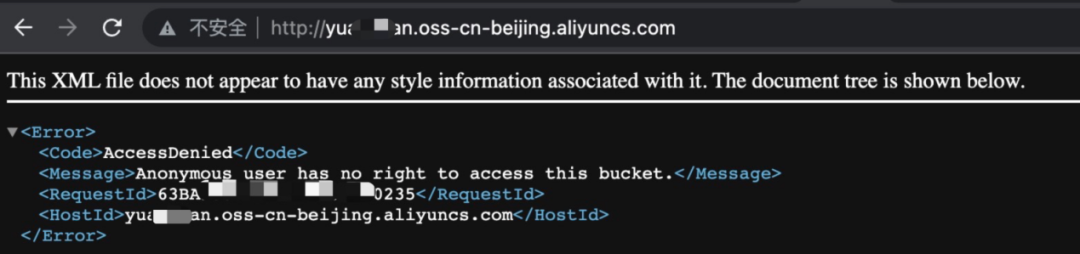 根据阿里云存储桶域名构造文档,已知存储桶名称和地理位置,构造访问域名: http://yxxxxxan.oss-cn-beijing.aliyuncs.com, 如图所示,无权限访问;![]()