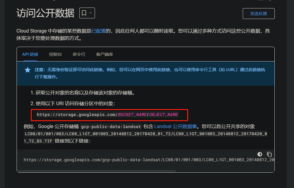 根据谷歌存储桶域名访问文档,存储桶地址没有区域之分,已知存储桶名称,构造域名: http://storage.googleapis.com/存储桶名称 或 http://存储桶名称.storage.googleapis.com/,可正常访问:![]()
