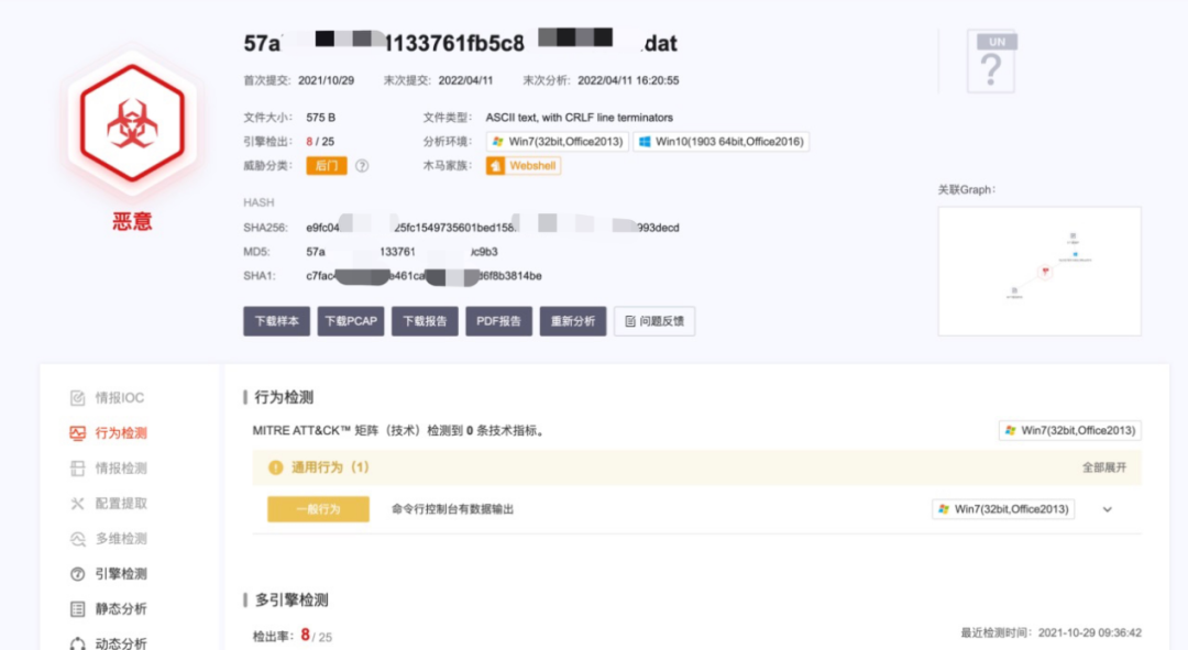 通过微步云沙箱进一步确认,判定文件确实存在恶意行为,如图所示:5.2 恶意文件关联