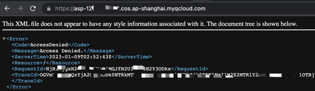 根据腾讯云存储桶文档,我们根据存储桶名称以及地理位置构造访问域名https://asp-12xxxxx22.cos.ap-shanghai.myqcloud.com,无权限访问;![]()