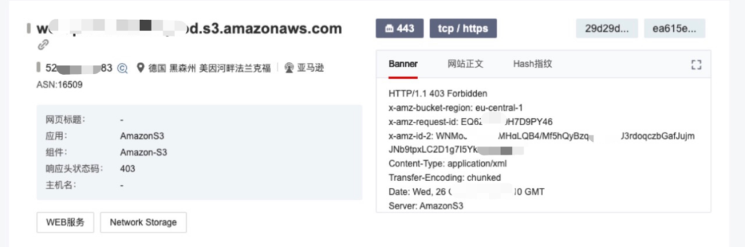 根据S3全局端点存储桶域名特征包含‘s3.amazonaws.com’在X情报社区-资产测绘检索,资产示例如下图所示:![]()