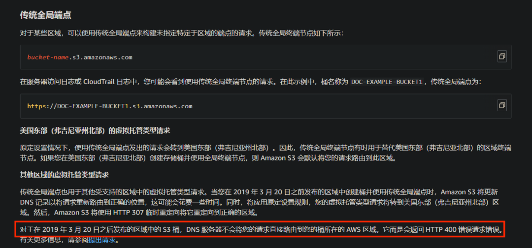 Amazon作为全球最大的公有云厂商之一,其所提供的S3存储桶服务正在被许多租户所使用。S3存储桶的一种访问域名形式为https://.s3..amazonaws.com/, 在这种域名形式下,变量主要有两个,分别为存储桶名bucket-name,存储桶所在区域region;注意:s3默认必须加区域,某些区域才能不加region-code。如下图所示:![]()