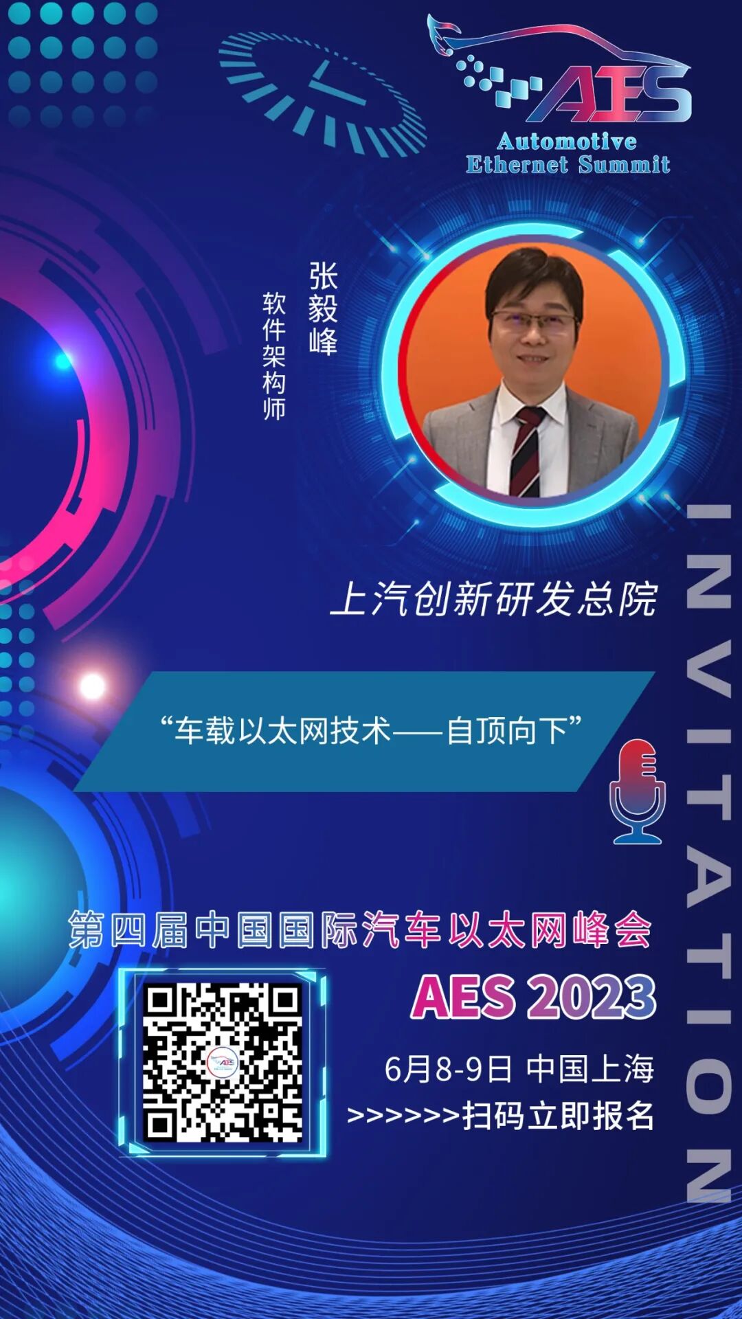此次,上汽创新研发总院软件架构师张毅峰,将在AES 2023上分享“ 车载以太网技术——自顶向下 ”的精彩话题。
