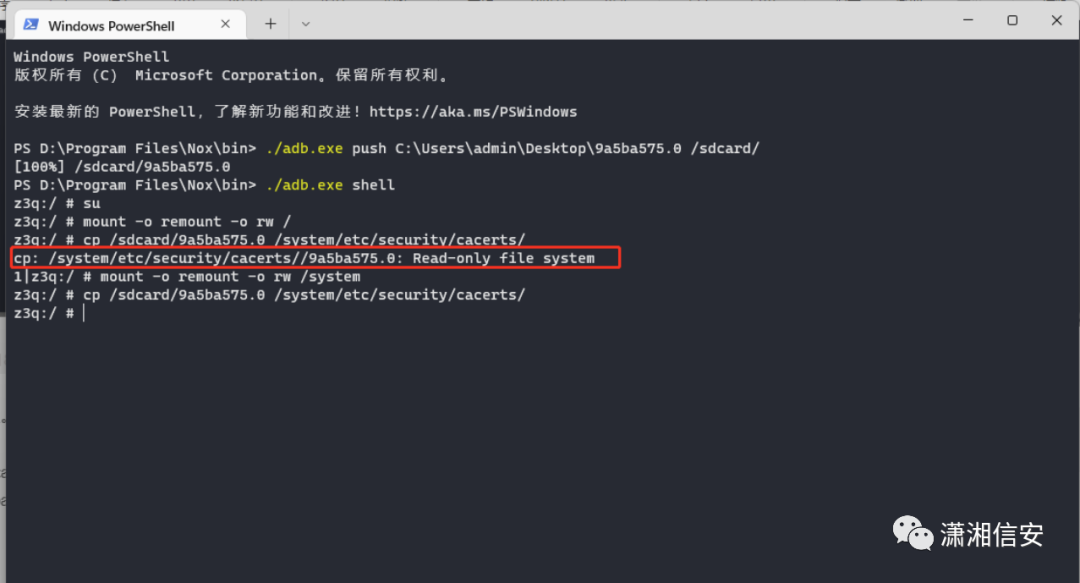 打开adb,夜神模拟器自带,如果没有可以自己下载一个将证书复制到安卓目录下