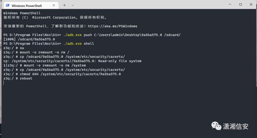 cp /sdcard/9a5ba575.0 /system/etc/security/cacerts/chmod 644 /system/etc/security/cacerts/9a5ba575.0