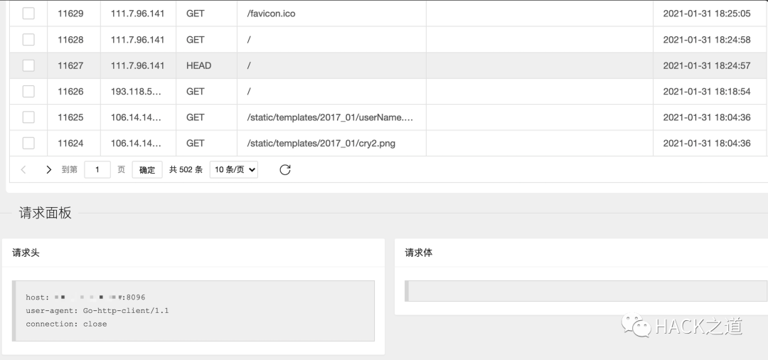 4.创宇的censys爬虫先是先访问了8090端口,然后是88端口,中间间隔了将近14小时,bing的爬虫也到访过一次,fofa的爬虫没看到,但是有上百条ua为Go-http-client/1.1和fasthttp的请求,python的只有一条。