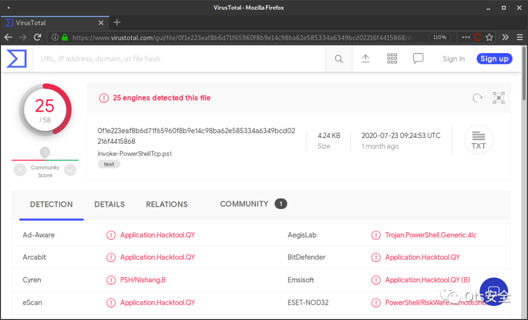 下面是 Nishang 的Invoke-PowerShellTcp.ps1的片段,位于nishang/Shells。VirusTotal 报告了25 次PS1 脚本检测。