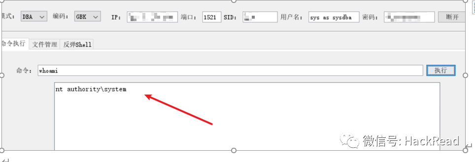 在前面的信息收集过程中,已经发现了x.test.com这个子域名对应的ip地址开放了oracle数据库端口,我迅速连接了此数据库发现用户名密码正确,可以连接。