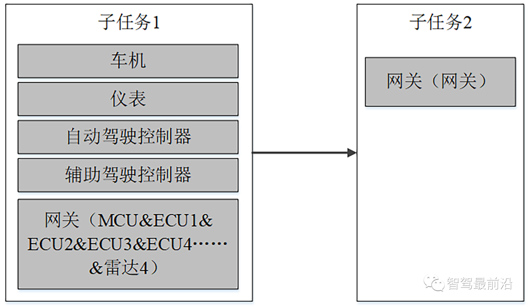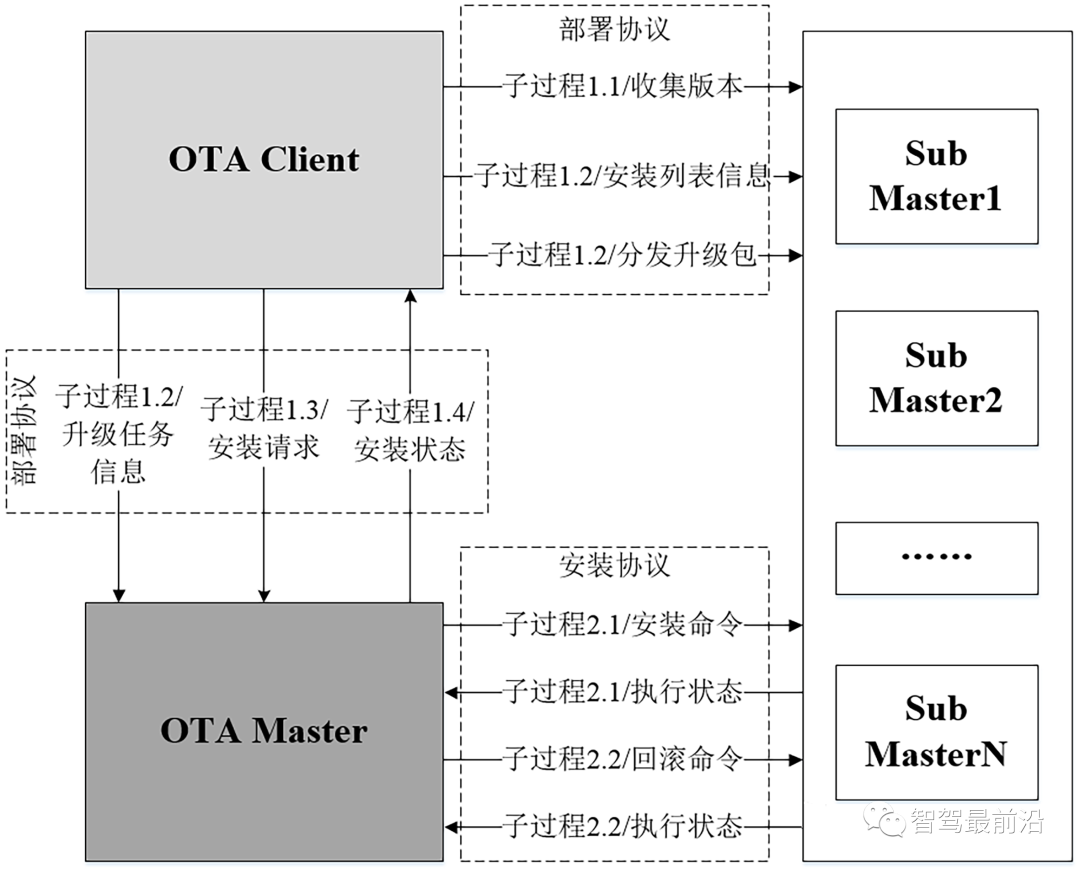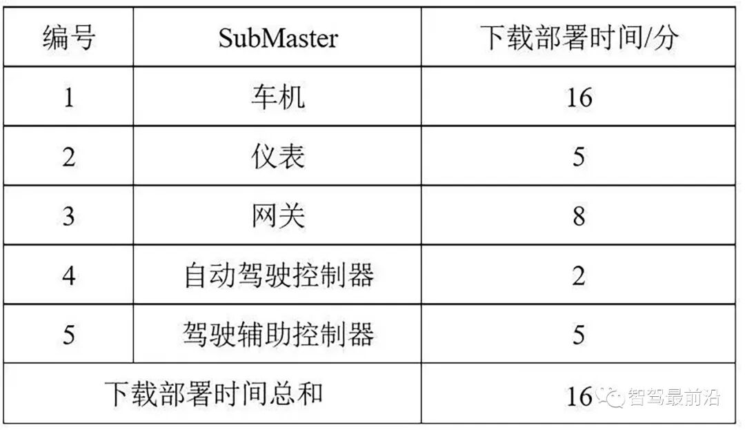 1)下载部署过程,OTAClient将下载过程和分发过程进行同步处理,使两个过程可以并发执行,以缩短升级包下载部署的时间,同时减少对储存空间的需求。OTAClient根据硬件通道的不同,优先下载数据传输速率低的SubMaster节点的升级包,最后下载OTAClient所在的SubMaster节点的升级包;单个SubMaster的升级包下载完成就可以进行文件部署。如果在下载部署过程中,车辆熄火,则停止下载和部署;下次点火后,继续在断点处执行。整个过程可以在行车中执行,不影响用户用车。2)安装过程,由OTAMaster集成控制,用户确认发起安装后,OTAMaster根据升级信息中安装条件,检测整车安装条件是否满足,发起安装后一直保持安装的状态,如电源档位、行车档位、整车OTA状态等。OTA Master依次向各个的SubMaster发送安装请求;收到安装请求,SubMaster各自执行升级,SubMaster之间可以进行并行升级。通常网关作为传统控制器的SubMaster,实现各个网段之间的并行刷写。OTA Master按照升级任务中安装顺序执行,安装顺序由多个子任务组成,子任务之间串行执行,而子任务内的升级对象则是并行执行升级。如果控制器的安装顺序存在依赖,则需要把被依赖和依赖的控制器划分到不同的子任务中,并分配为先后的顺序。升级任务的安装总时间如公式(1)所示:其中,t_n 为子任务n中的耗时最长的SubMaster的安装时间。为了满足车端OTA过程中功能模块之间数据交互的,本方案中设计了两套通信协议,如图3所示。1)部署协议,主要在部署过程和人机交互过程中使用。协议采用的是客户端和服务端(C/S)的模式,OTAClient作为客户端,SubMaster和OTA Master作为服务端。物理的通道包括CANFD、以太网、USB等。部署协议的交互覆盖四个子过程。a)子过程1.1版本收集:OTAClient向各个SubMaster发出版本收集请求,SubMaster收集版本的范围包括其所部署的控制器的软件版本、以及所负责刷写的其他控制器或者控制升级的其他固件的软件版本。b)子过程1.2升级信息和升级包的分发:OTAClient下载完成后,要向各个Sub Master传输升级包,以及升级对象的信息。OTAClient向OTAMaster发送升级任务信息。c)子过程1.3发起安装请求:OTAClient根据人机交互的触发,发送安装请求到OTAMaster;如果支持升级取消,详情请关注公众号【车端】也通过该子过程发送请求。d)子过程1.4安装状态查询:OTAClient查询OTAMaster的安装条件检查及结果、安装执行的状态、安装进度和安装结果,用于人机交互界面的显示。2)安装控制协议,主要是在安装过程中使用,通过诊断服务,借助诊断通道到达全车所有的控制器。安装控制协议的交互覆盖了两个子过程分别是,子过程2.1安装控制:OTAMaster按照升级任务,向子任务中的各个SubMaster发出安装命令请求,查询安装的进度,SubMaster返回执行状态。子过程2.1回滚控制:当所有的子任务安装执行完成后,OTAMaster读取安装结果,判断是否有升级对象安装失败;并读取升级任务中的关联组新,如果升级失败的对象和其他升级对象是在一个关联组内,则向该组内其他升级对象的SubMaster发出回滚命令请求,查询回滚的进度,SubMaster返回执行状态。按照以上的整车OTA设计,在某车型项目上开发整车OTA功能,如图4所示,部署升级功能模块和搭建升级通道。车机作为OTAClient,网关作为OTA Master,实现对座舱域、车身域、动力域、底盘域、自动驾驶域的控制器的OTA功能;覆盖了18个控制器,其中包括4个智能控制系统,14个传统控制器;部署了5个SubMaster节点,分别是车机、仪表、网关、自动驾驶控制器、驾驶辅助控制器。在OTA管理平台配置车型信息和控制器的升级依赖关系,发布升级任务,选择对18个控制器,详情请关注公众号【车端】即所有升级对象进行升级,云端自动生成升级任务信息,其中的安装顺序如图5所示。按照图5的安装顺序,对车端OTA的过程进行记录,下载部署过程和安装过程的时间分别如表1和表2所示。从下载到安装一共需要44分钟,影响用户体验的升级时间主要是安装过程,用户需要等待升级完成的时间是28分钟。如果所有控制器都采用串行的升级顺序,安装过程的时间是77分钟。本方案用户等待升级时间明显缩短,相比串行升级时间降低63.6%,大幅提升了OTA的用户体验满意度。如表2所示,安装过程的耗时瓶颈主要在CANFD1网段,如果在其他网段上适当增加控制器则不会影响总的时间。如果要缩短总时间,需要对CANFD1网段的控制器进行优化,优化方向主要是减少升级包大小、将传统控制器改为智能控制系统等。本文提出的一种基于电子电器架构的整车OTA设计方案,实现了对升级对象的统一管理、对升级过程的集中控制、对升级功能的模块化设计。从试验的效果来看,通过OTA管理平台配置升级策略、明显缩短了升级时间,是一个可实施、可平台化的设计。本设计方案可应用于其他车型的整车OTA,解决了整车OTA控制器多、升级过程不可控、升级时间长和稳定性差等问题,形成了一套从云端到车端完整的持续迭代更新能力和智能网联汽车价值提升的新动力。来源:智驾最前沿