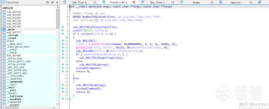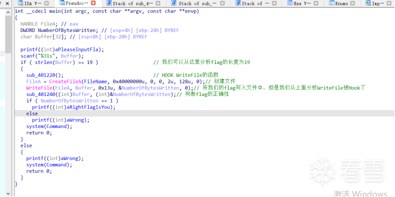 步骤二:分析伪代码,如下图是我整理的伪代码注释,我们分析完毕后可以知道flag的长度为19,sub_401220()函数就是hook函数,hook的是WriteFile函数。加密过程也在该函数里面。