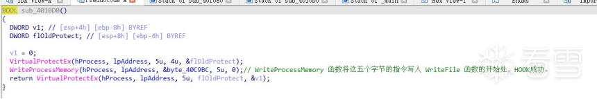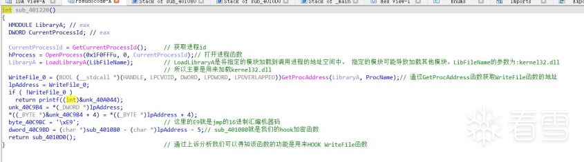 步骤四:进入sub_401220()函数分析,这个函数逻辑清晰地找到了库函数 WriteFile 的地址,向 byte_40C9BC 中载入了 JUMP 指令的字节码 E9,计算了 sub_401080 距离 WriteFile 的第五个字节的距离。我们分析先sub_4010D0()函数。