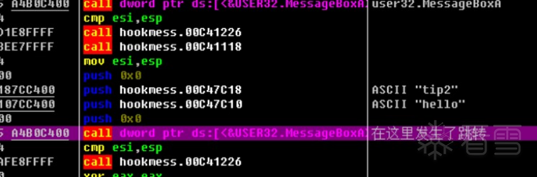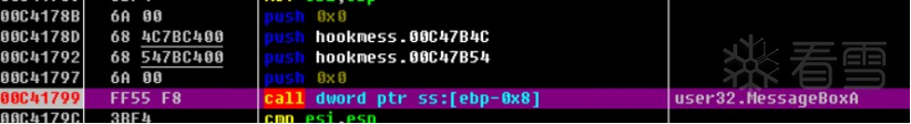 这四个push是hook前的函数流程,将该四个push压入堆栈后,在运行到光标的call中跳入到前面的MessageBoxA函数流程。