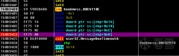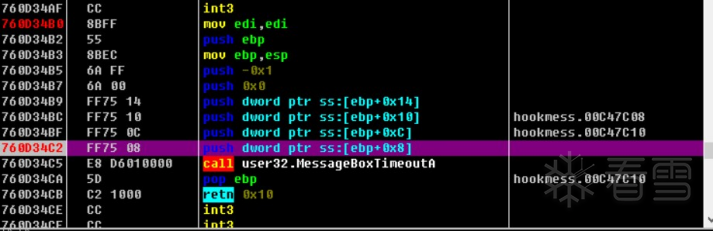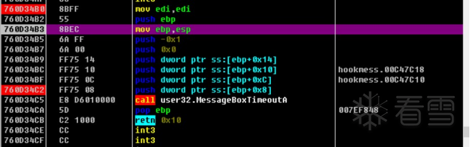 我们可以看到760D34B0就是我们BP MessageBoxA下断点后的地址,我们可以记住这个地址,因为我们HOOK主要修改的就是该地址,下面我们从汇编代码分析该函数流程。