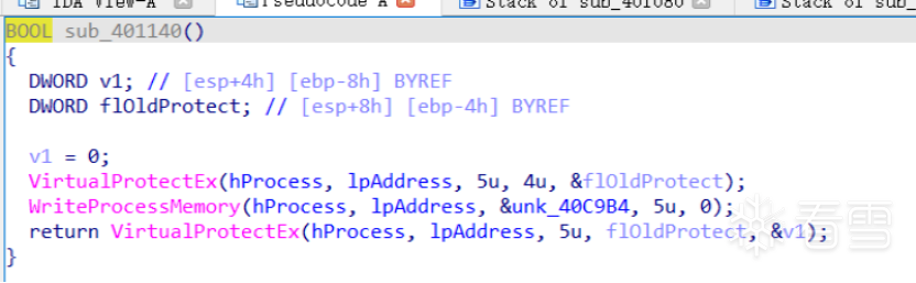 步骤六:进入sub_401080()函数分析,该函数就是我们HOOK的返回值,通过sub_401080()函数重新定义了一个WriteFile函数,修改了参数里面的值。我们先分析sub_401140()函数有什么用。