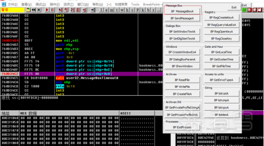 方法三:利用吾爱破解里面的OD插件给MessageBoxA下断点。