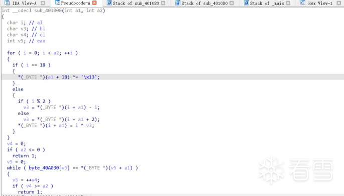 步骤八:进入sub_401000()函数分析,该函数就是我们加密的函数,flag由此解密,简单的异或,第一个判断i=18时,flag[i] = a1[i] ^ 0x13; i 不等于18时,第二个判断,if (i % 2),满足条件flag[i] = (a1[i] ^ i) + i,不满足条件flag[i+2] = (res[i] ^ i)。至此IDA的分析就完成了,接下来就是写解密脚本了。