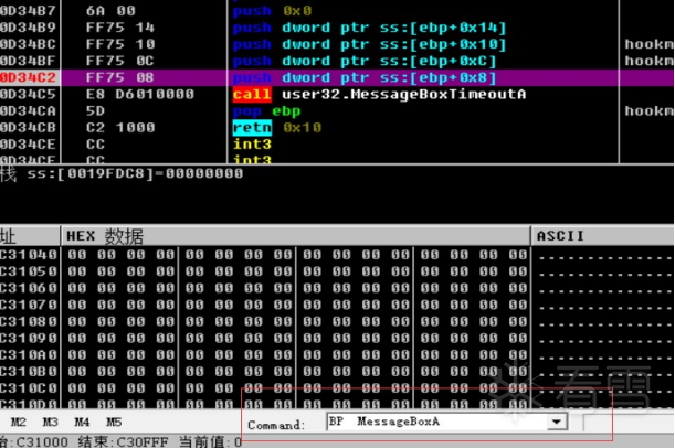 方法二:在Command后面红色标注的命令框里输入:BP MessageBoxA。