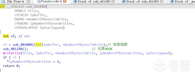 步骤七:进入sub_401140()函数分析,在 sub_401000() 函数加密完 lpBuffer 后,sub_401140又把 WriteFile 函数还原,继续写操作。
