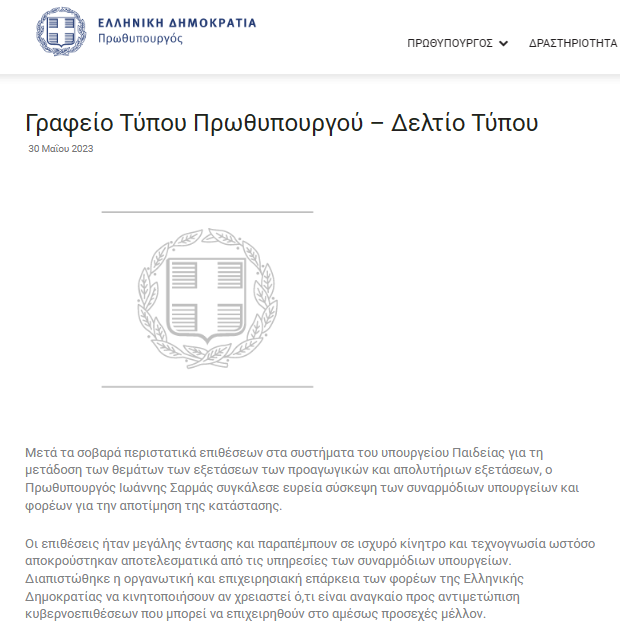 在传输升学和文凭考试题目的系统遭到严重攻击之后,希腊扬尼斯·萨尔马斯总理立即为此召集了有关部委和机构的广泛会议,以评估具体情况。根据总理新闻办公室的新闻稿,这些攻击非常激烈,显示出强烈的动机和专业知识。所幸攻击已经被主管部门击退,并且未对系统造成损害。