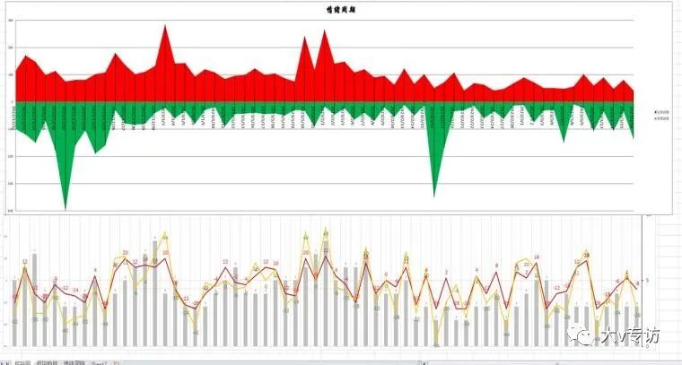 以上三张图,前两张图大概三十多组数据构成了我的黄色曲线和红色曲线的数据(不要和我所要数据表格,谢谢)怎么制作我再之前的课程里已经讲过了。自己动手才能感受到市场的情绪,数据组是可以增加或减少的,随着市场的变化而变化,第三张图是我用来分析主线周期的。我只是想告诉大家,统计学作为基础来研究情绪周期绝对靠谱。