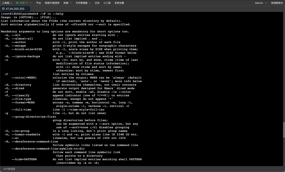 ls -als -lhls -rls -tls -R directory/[[email protected] /]# ls --helpUsage: ls [OPTION]... [FILE]...List information about the FILEs (the current directory by default).Sort entries alphabetically if none of -cftuvSUX nor --sort is specified.Mandatory arguments to long options are mandatory for short options too.-a, --all do not ignore entries starting with .-A, --almost-all do not list implied . and ..--author with -l, print the author of each file-b, --escape print C-style escapes for nongraphic characters--block-size=SIZE with -l, scale sizes by SIZE when printing them;e.g., '--block-size=M'; see SIZE format below-B, --ignore-backups do not list implied entries ending with ~-c with -lt: sort by, and show, ctime (time of lastmodification of file status information);with -l: show ctime and sort by name;otherwise: sort by ctime, newest first-C list entries by columns--color[=WHEN] colorize the output; WHEN can be 'always' (defaultif omitted), 'auto', or 'never'; more info below-d, --directory list directories themselves, not their contents-D, --dired generate output designed for Emacs' dired mode-f do not sort, enable -aU, disable -ls --color-F, --classify append indicator (one of */=>@|) to entries--file-type likewise, except do not append '*'--format=WORD across -x, commas -m, horizontal -x, long -l,single-column -1, verbose -l, vertical -C--full-time like -l --time-style=full-iso-g like -l, but do not list owner--group-directories-firstgroup directories before files;can be augmented with a --sort option, but anyuse of --sort=none (-U) disables grouping-G, --no-group in a long listing, don't print group names-h, --human-readable with -l and -s, print sizes like 1K 234M 2G etc.--si likewise, but use powers of 1000 not 1024-H, --dereference-command-linefollow symbolic links listed on the command line--dereference-command-line-symlink-to-dirfollow each command line symbolic linkthat points to a directory--hide=PATTERN do not list implied entries matching shell PATTERN(overridden by -a or -A)--hyperlink[=WHEN] hyperlink file names; WHEN can be 'always'(default if omitted), 'auto', or 'never'--indicator-style=WORD append indicator with style WORD to entry names:none (default), slash (-p),file-type (--file-type), classify (-F)-i, --inode print the index number of each file-I, --ignore=PATTERN do not list implied entries matching shell PATTERN-k, --kibibytes default to 1024-byte blocks for disk usage;used only with -s and per directory totals-l use a long listing format-L, --dereference when showing file information for a symboliclink, show information for the file the linkreferences rather than for the link itself-m fill width with a comma separated list of entries-n, --numeric-uid-gid like -l, but list numeric user and group IDs-N, --literal print entry names without quoting-o like -l, but do not list group information-p, --indicator-style=slashappend / indicator to directories-q, --hide-control-chars print ? instead of nongraphic characters--show-control-chars show nongraphic characters as-is (the default,unless program is 'ls' and output is a terminal)-Q, --quote-name enclose entry names in double quotes--quoting-style=WORD use quoting style WORD for entry names:literal, locale, shell, shell-always,shell-escape, shell-escape-always, c, escape(overrides QUOTING_STYLE environment variable)-r, --reverse reverse order while sorting-R, --recursive list subdirectories recursively-s, --size print the allocated size of each file, in blocks-S sort by file size, largest first--sort=WORD sort by WORD instead of name: none (-U), size (-S),time (-t), version (-v), extension (-X)--time=WORD change the default of using modification times;access time (-u): atime, access, use;change time (-c): ctime, status;birth time: birth, creation;with -l, WORD determines which time to show;with --sort=time, sort by WORD (newest first)--time-style=TIME_STYLE time/date format with -l; see TIME_STYLE below-t sort by time, newest first; see --time-T, --tabsize=COLS assume tab stops at each COLS instead of 8-u with -lt: sort by, and show, access time;with -l: show access time and sort by name;otherwise: sort by access time, newest first-U do not sort; list entries in directory order-v natural sort of (version) numbers within text-w, --width=COLS set output width to COLS. 0 means no limit-x list entries by lines instead of by columns-X sort alphabetically by entry extension-Z, --context print any security context of each file-1 list one file per line. Avoid '\n' with -q or -b--help display this help and exit--version output version information and exitThe SIZE argument is an integer and optional unit (example: 10K is 10*1024).Units are K,M,G,T,P,E,Z,Y (powers of 1024) or KB,MB,... (powers of 1000).Binary prefixes can be used, too: KiB=K, MiB=M, and so on.The TIME_STYLE argument can be full-iso, long-iso, iso, locale, or +FORMAT.FORMAT is interpreted like in date(1). If FORMAT is FORMAT1<newline>FORMAT2,then FORMAT1 applies to non-recent files and FORMAT2 to recent files.TIME_STYLE prefixed with 'posix-' takes effect only outside the POSIX locale.Also the TIME_STYLE environment variable sets the default style to use.Using color to distinguish file types is disabled both by default andwith --color=never. With --color=auto, ls emits color codes only whenstandard output is connected to a terminal. The LS_COLORS environmentvariable can change the settings. Use the dircolors command to set it.Exit status:0 if OK,1 if minor problems (e.g., cannot access subdirectory),2 if serious trouble (e.g., cannot access command-line argument).GNU coreutils online help: <https://www.gnu.org/software/coreutils/>Full documentation <https://www.gnu.org/software/coreutils/ls>or available locally via: info '(coreutils) ls invocation'