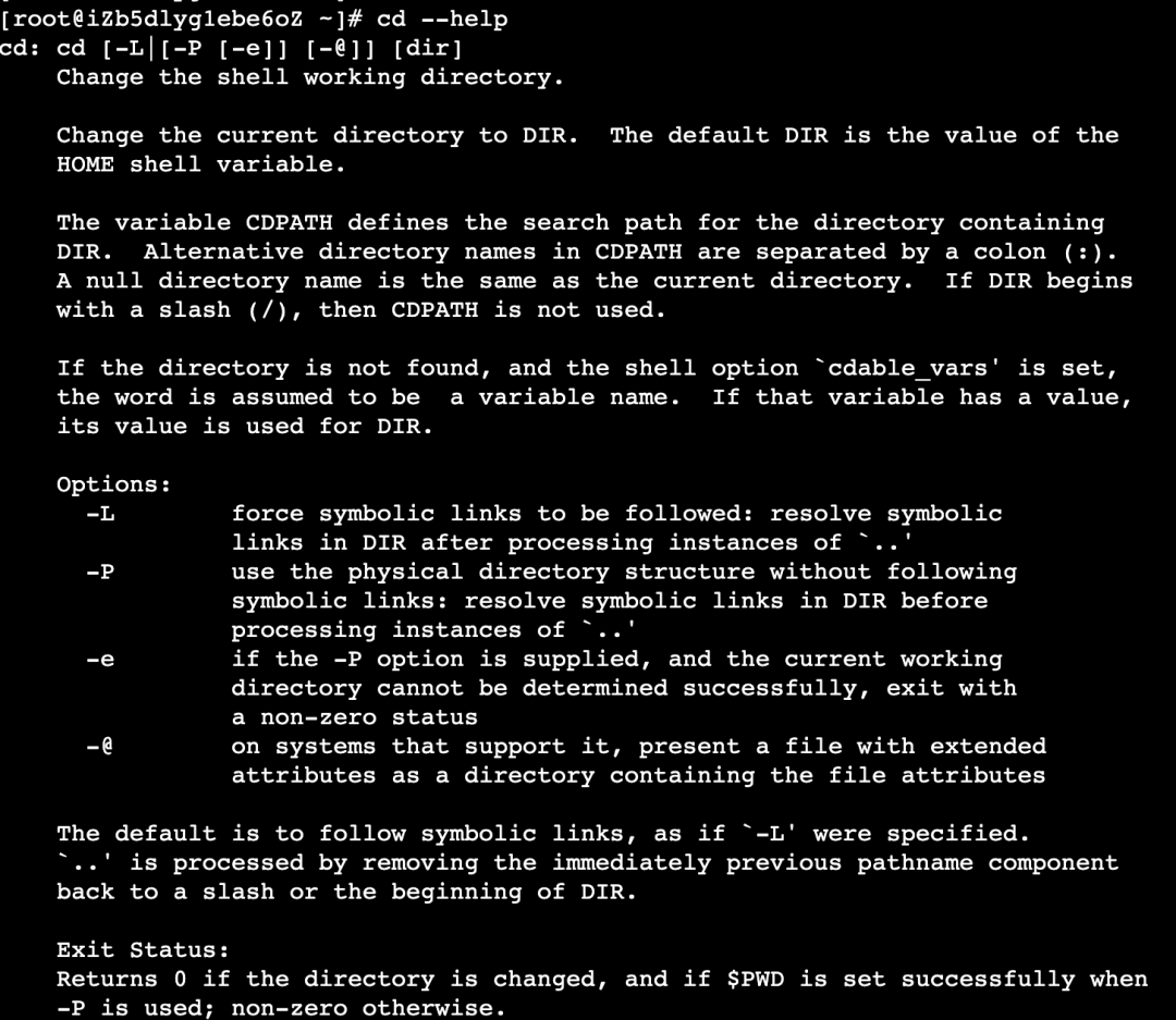 cd /cd -[[email protected] ~]# cd --helpcd: cd [-L|[-P [-e]] [[email protected]]] [dir]Change the shell working directory.Change the current directory to DIR. The default DIR is the value of theHOME shell variable.The variable CDPATH defines the search path for the directory containingDIR. Alternative directory names in CDPATH are separated by a colon (:).A null directory name is the same as the current directory. If DIR beginswith a slash (/), then CDPATH is not used.If the directory is not found, and the shell option `cdable_vars' is set,the word is assumed to be a variable name. If that variable has a value,its value is used for DIR.Options:-L force symbolic links to be followed: resolve symboliclinks in DIR after processing instances of `..'-P use the physical directory structure without followingsymbolic links: resolve symbolic links in DIR beforeprocessing instances of `..'-e if the -P option is supplied, and the current workingdirectory cannot be determined successfully, exit witha non-zero status[email protected] on systems that support it, present a file with extendedattributes as a directory containing the file attributesThe default is to follow symbolic links, as if `-L' were specified.`..' is processed by removing the immediately previous pathname componentback to a slash or the beginning of DIR.Exit Status:Returns 0 if the directory is changed, and if $PWD is set successfully when-P is used; non-zero otherwise.